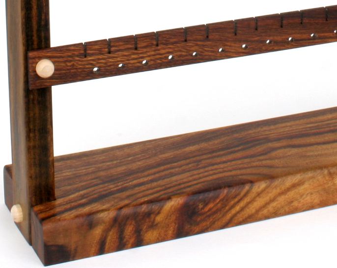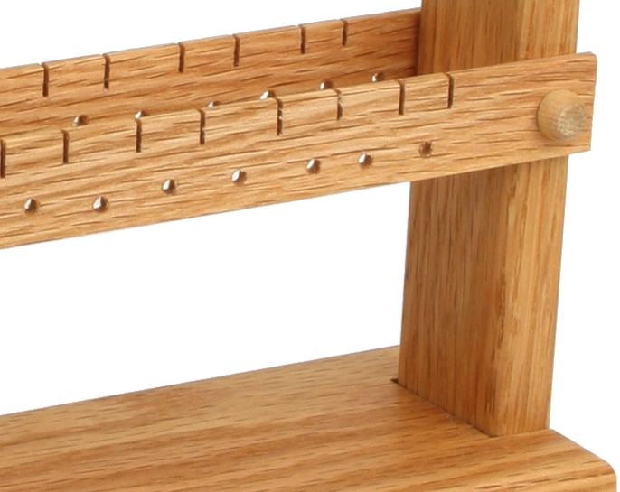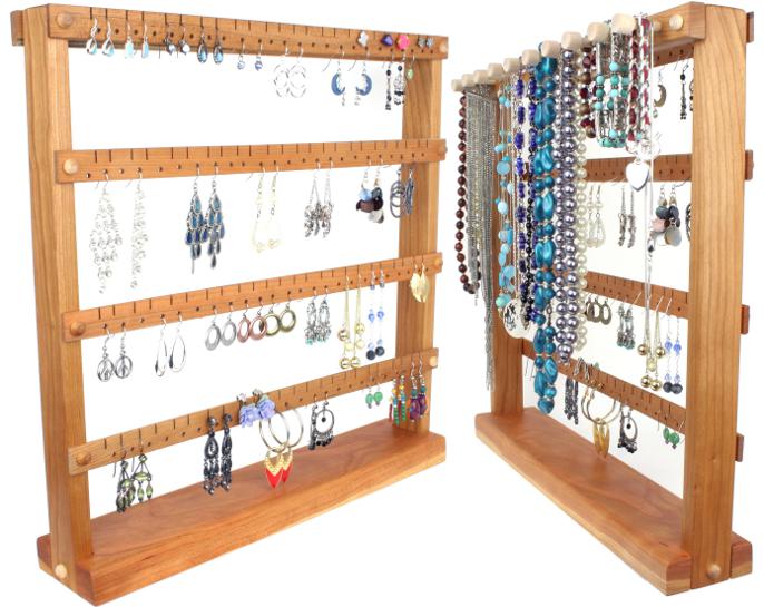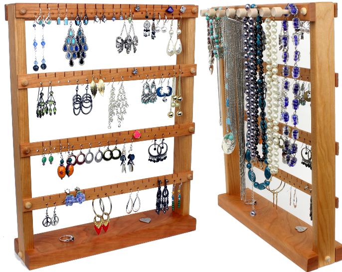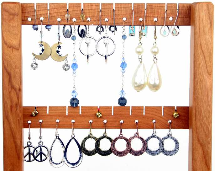 All of Tom's earring holders accommodate studs, wires, clip-ons, loops, hoops, leverbacks and more. If it fits on your ear, it will probably find a place on these holders. These jewelry holders have a necklace bar on the back that varies from 4 pegs for the 7" wide holders to 10 pegs for the 15" wide holders.