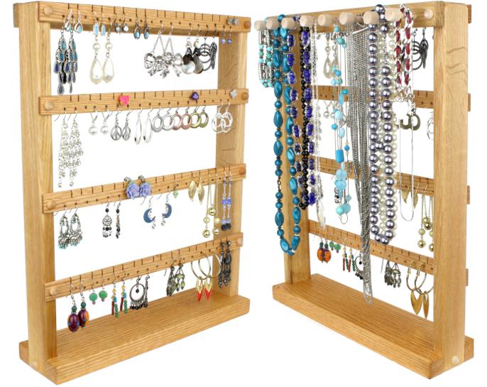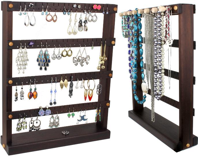 Do your necklaces sit in a pile? Are your earring all jumbled up? Look no further! Tom's earring holder stands with necklace bar on the back are the perfect solution for your jewelry holder needs. This jewelry holder has a compact design so it won't take up a lot of space on your dresser while storing your collection of earrings and necklaces.