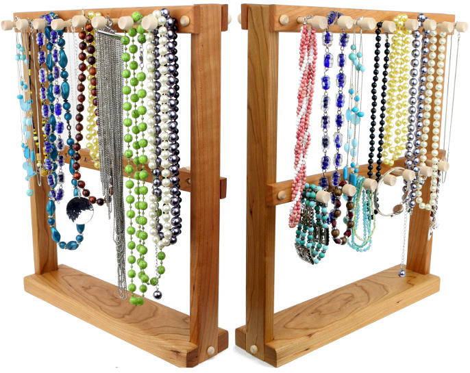 Are your necklaces always getting tangled up in your dresser drawer or maybe in some jewelry box somewhere? Here's the solution you've been looking for! Tom's double sided necklace stands are the perfect jewelry holder to display and access your collection of necklaces, bracelets and watches. The pegs can even accommodate some rings, depending on the ring's size.