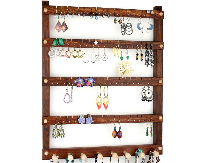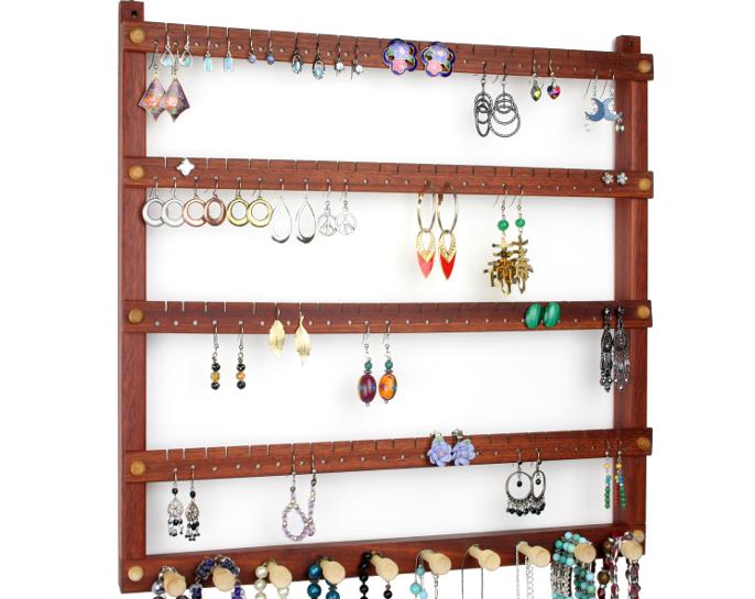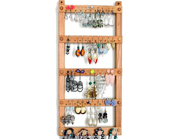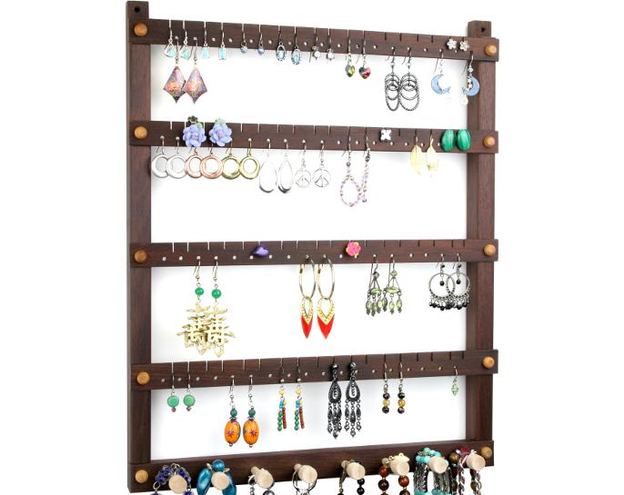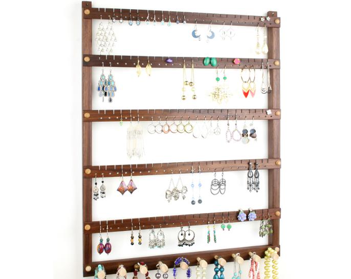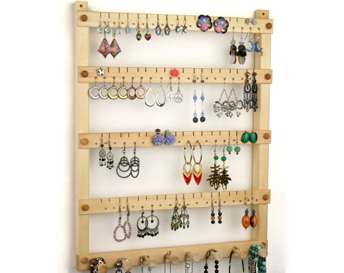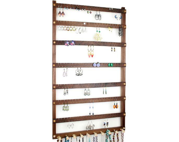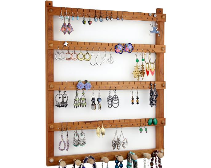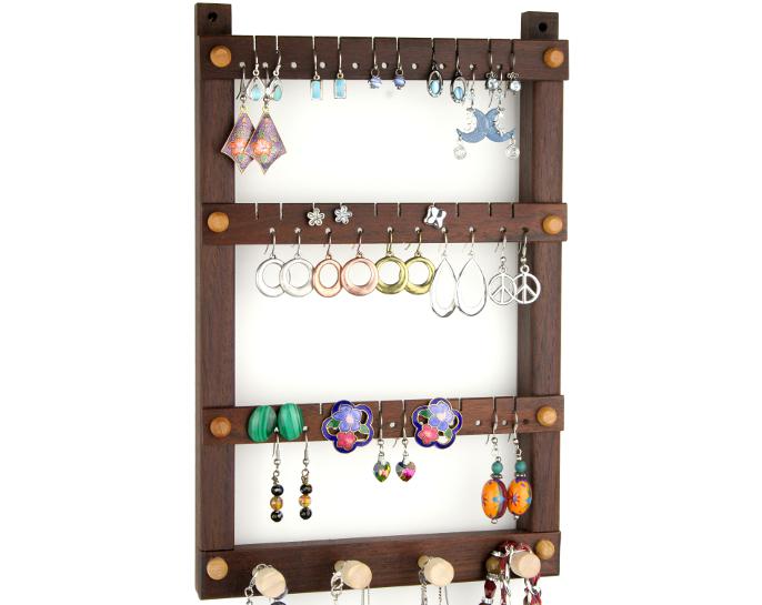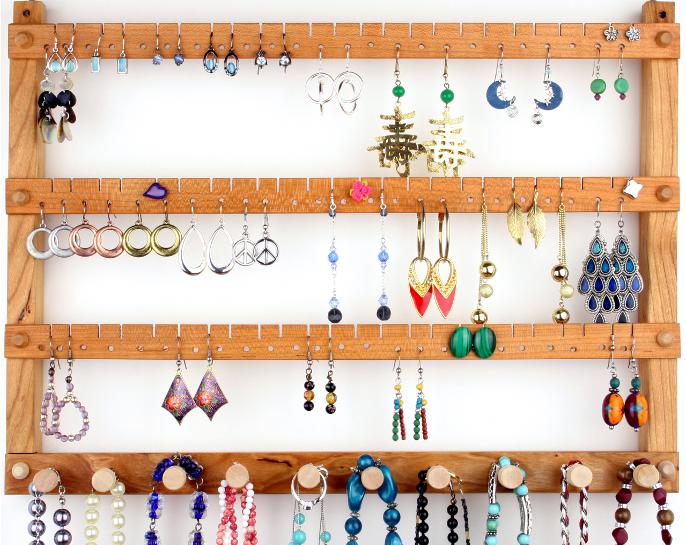All of Tom's earring holders accommodate studs, wires, clip-ons, loops, hoops, leverbacks and more. If it fits on your ear, it will probably find a place on these holders. Tom's wall mount jewelry holders have a necklace bar on the bottom that varies from 4 pegs for the 7" wide holders to 10 pegs for the 15" wide holders that can hold necklaces, bracelets, watches, rings and anything else you can fit on the pegs.